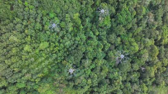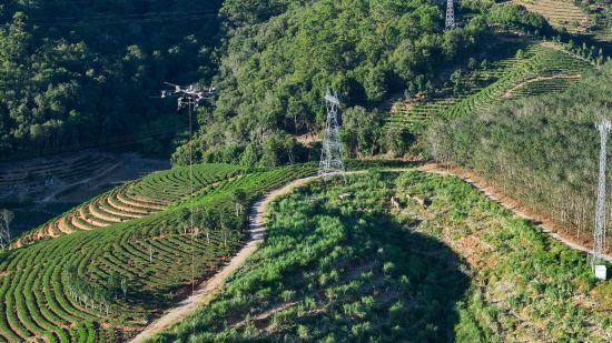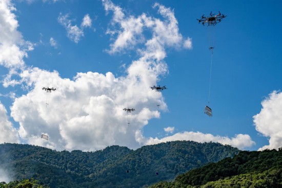 一架沉载无人机吊运着电力物资穿越正在西双版纳热带雨林上空,并放缓飞翔速度。